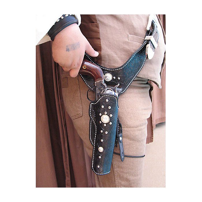 Meet The Bandito—the ultimate statement piece for anyone looking to blend style, craftsmanship, and functionality in their holster system. Finished in sleek black with contrasting white stitching, this holster is not just about carrying your firearm; it’s about making a statement. Featuring full carving with wages, silver conchos, buckles, and silver spots, The Bandito embodies the spirit of the Old West with a modern twist. Whether you’re headed to the range, a competition, or just showing off your collection, this holster delivers both form and function.